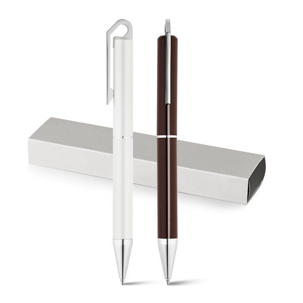 Bronze ballpoint with twist mechanism. Spring clip in iron with shiny chrome plating.Copper nib with shiny coating.Barrel with double finish: plated interior and shiny lacquered exterior.Metallic G2 refill. Blue Dokumental® ink.2.000 m of minimum writing length.ø11 x 142 mm | Case: 175 x 41 x 20 mm
