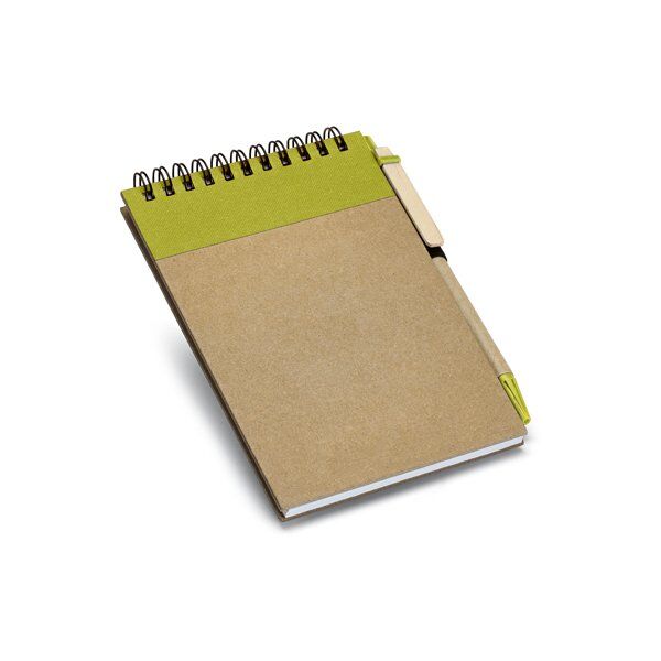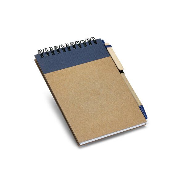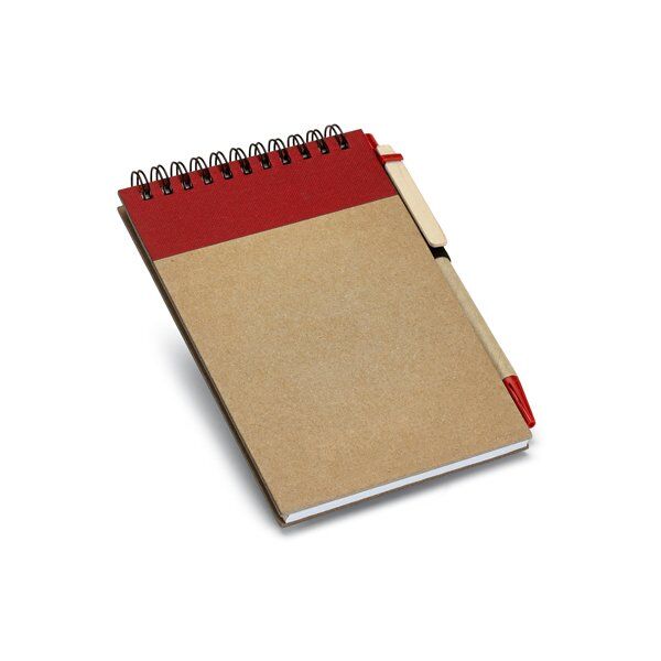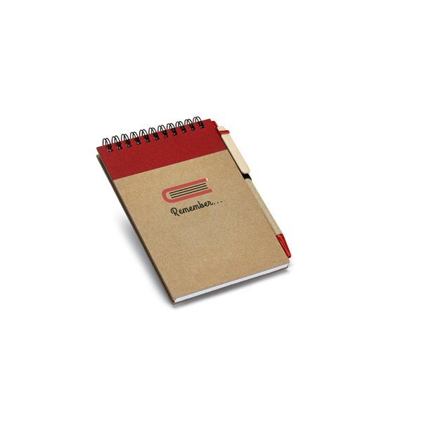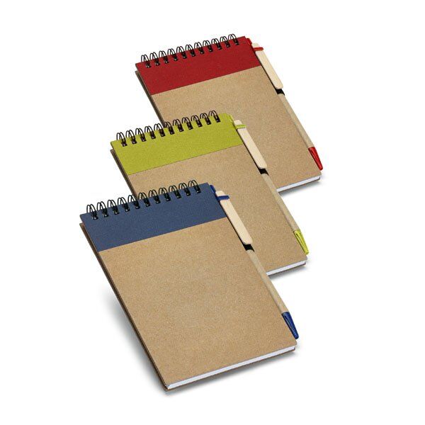 Notepad. Cardboard. Hardcover. With 120 recycled plain pages. Includes ball pen. 105 x 145 mm