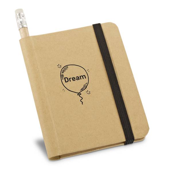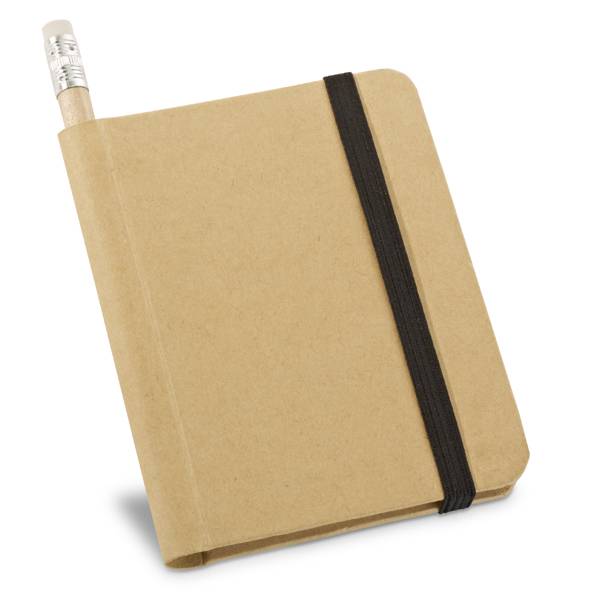 Notepad. Cardboard. Hardcover. With 140 recycled plain pages. Includes pencil.82 x 105 mm