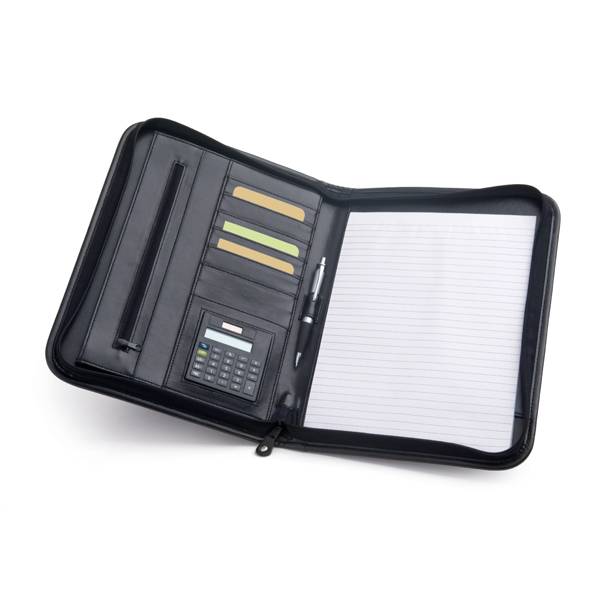 A4 folder. Imitation leather. With front pocket. 8-digit dual power calculator. Includes LR1130 battery. Notepad: 20 lined sheets. Ball pen not included.250 x 345 x 20 mm