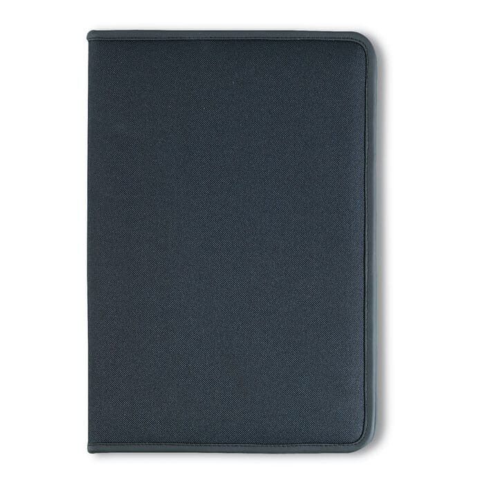 A4 writing case with zipper, 4 compartments and card holder. Inclusive of 20 page writing pad. 600D polyester and 210T lining.