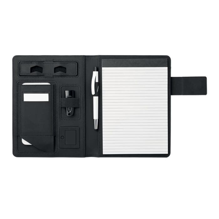 A5 portfolio in linen PU with magnetic closure including power bank with 4000 mAh capacity. Includes a built in micro USB to a Type C connector. Includes 20 page memo pad and several internal pockets.