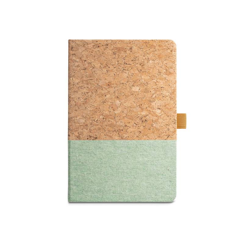 A5 notepad with cork cover and linen at the bottom of the cover. This notepad has 192 lined ivory pages from a sustainable forest management and pen holder (pen not included). Supplied in a kraft gift box. 140 x 210 mm