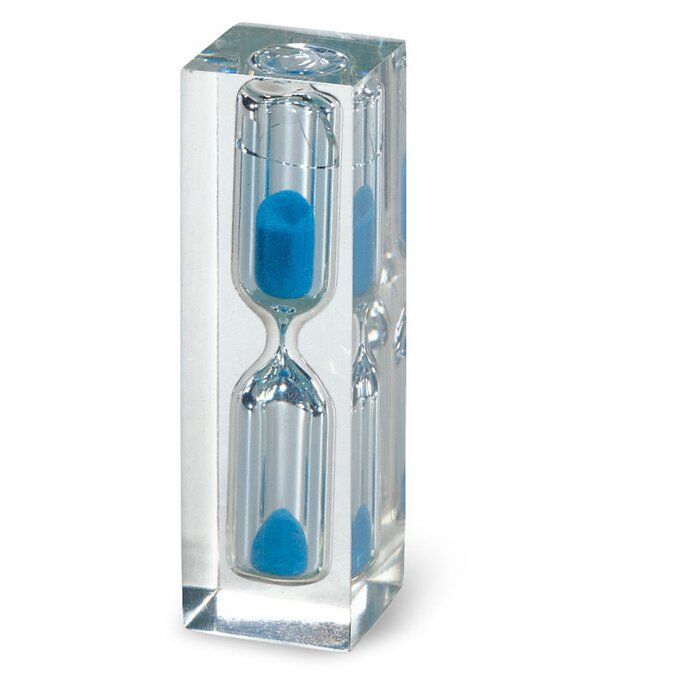 Sand timer with blue sand in transparent resin material.