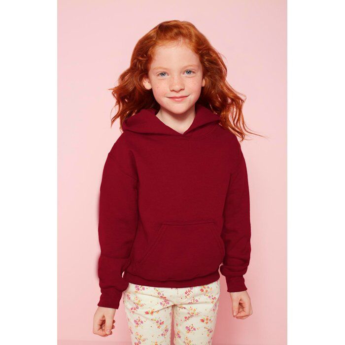 279 g/m2 (White 265 g/m2). 50% cotton, 50% polyester. Air jet yarn. Double-lined hood. Set-In sleeves. Cuffs and bottom hem 1×1 rib with spandex. Pouch pocket. Tubular construction. XS = (4-5) S = (6-7) M = (8-9) L = (10-12) XL = (13-14)
