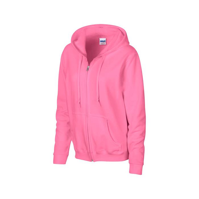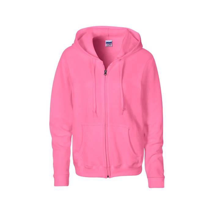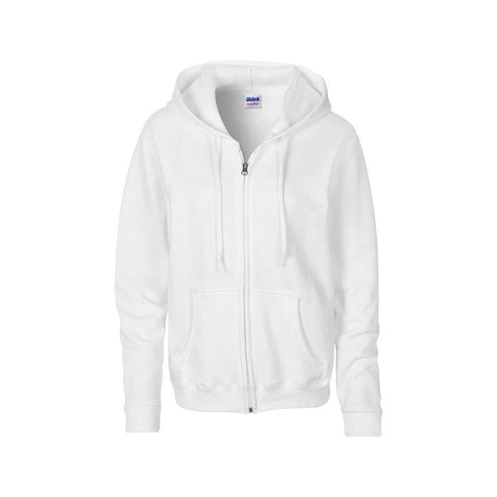Ladies full zipped hooded sweatshirt made from 270 g/m2 (White: 255 g/m2). 50% cotton, 50% pre-shrunk polyester. Air jet yarn gives a softer feel and no pilling. Unlined hood with colour-matched flat drawstring. YKK metal zipper. Overlapped fabric across zipper allows full chest printing. Pouch pockets. Three needle top stitched hood, pocket opening and waistband. Twin needle cuffs.