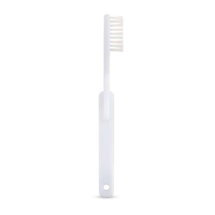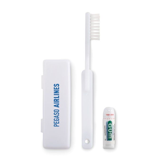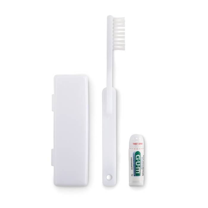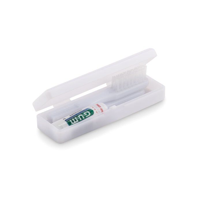Toothbrush and 3 gram peppermint toothpaste in convenient plastic travel box.