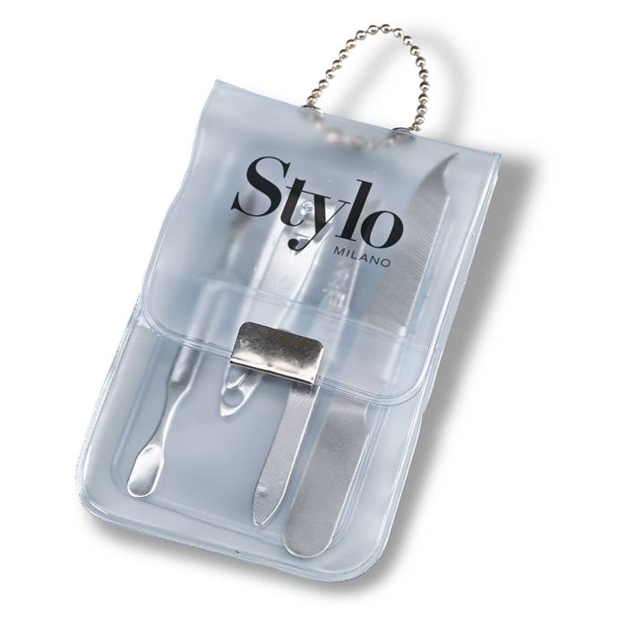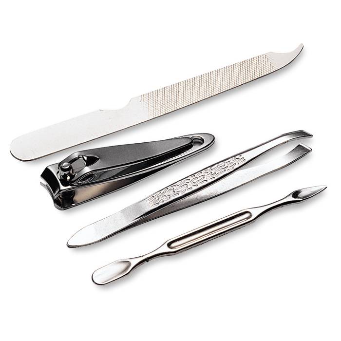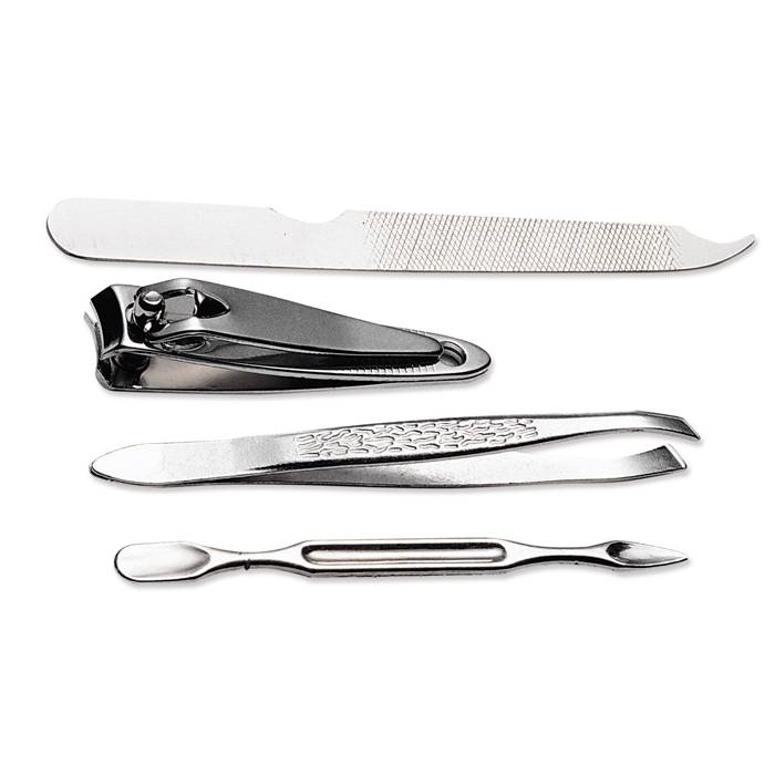 Manicure set in transparent case. Contains a pair of tweezers, nail clipper, nail cleaner and nail file.