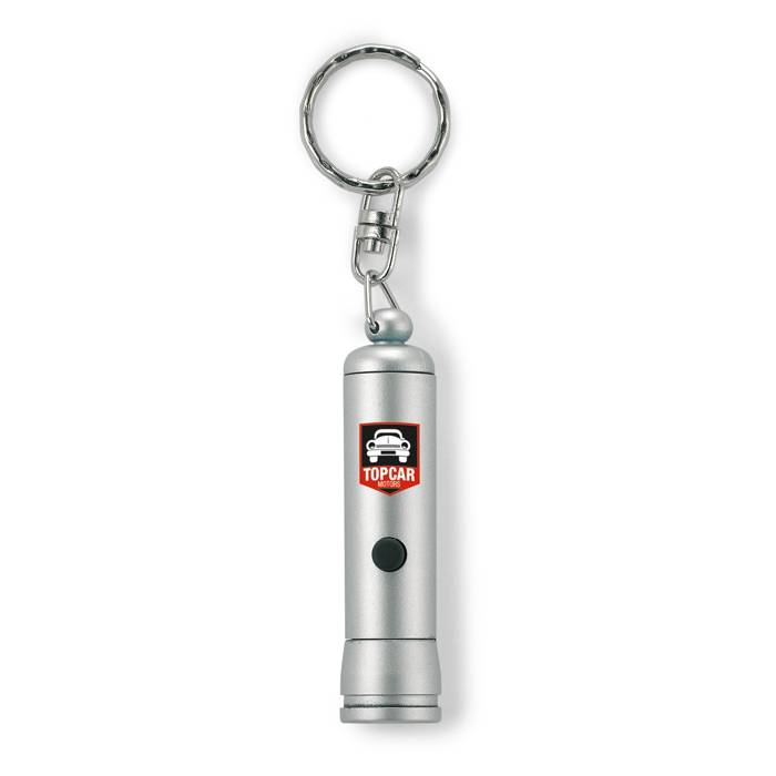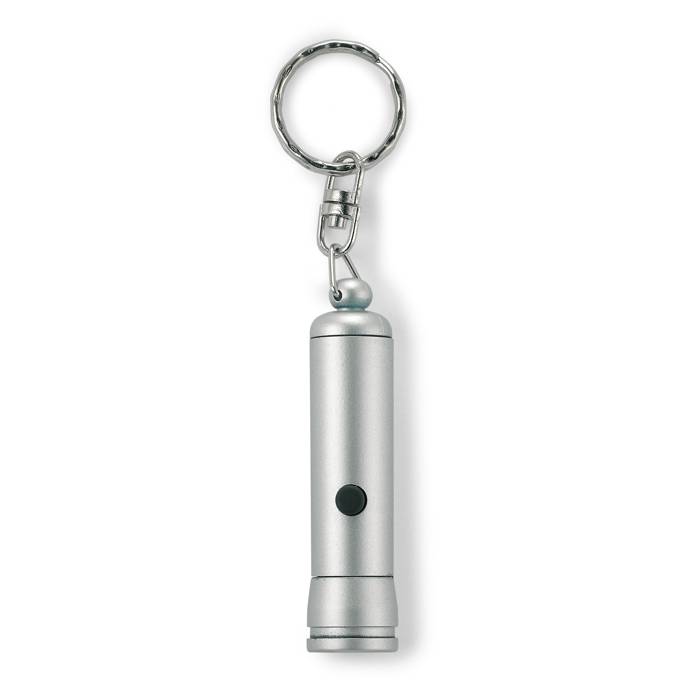 Plastic LED flashlight with key ring. Blue LED. 3 cell batteries included.