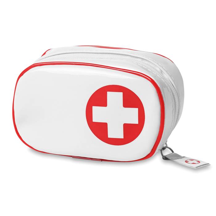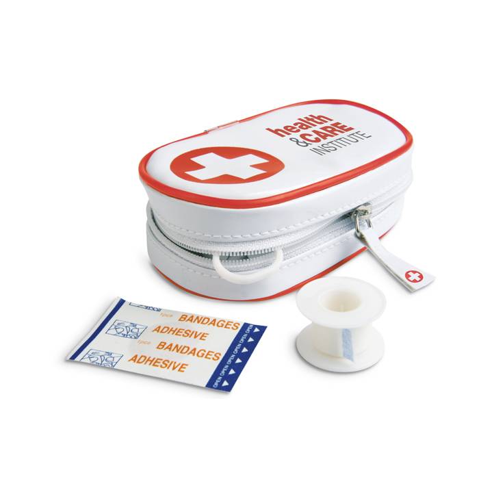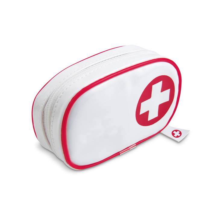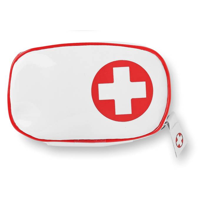First aid kit. Includes 1 pair of scissors, 3 pad bandages, 1 roll of cotton, 2 cleaning tissues, 5 adhesive bandages, 1 roll of tape and 6 cotton buds.