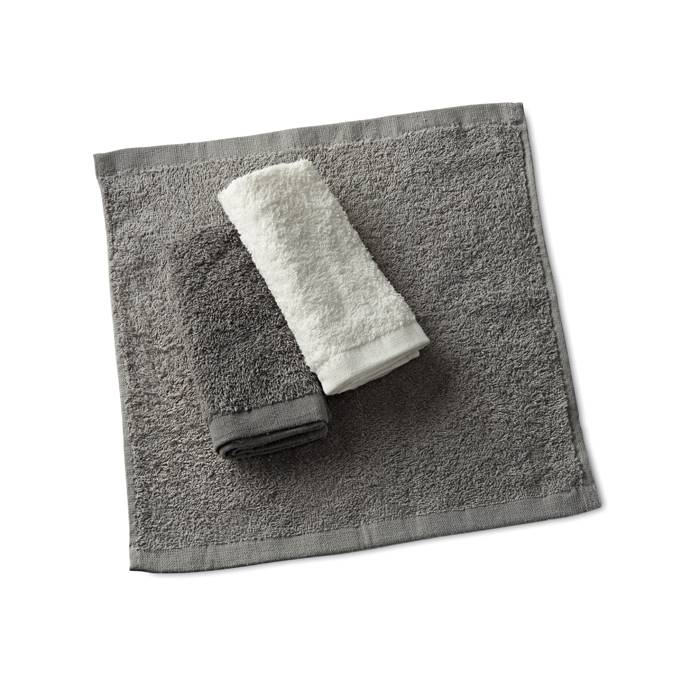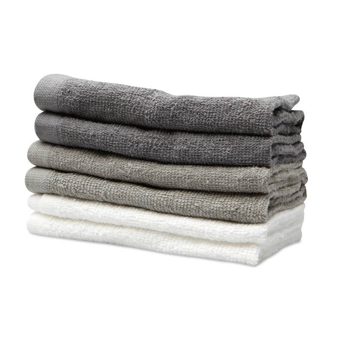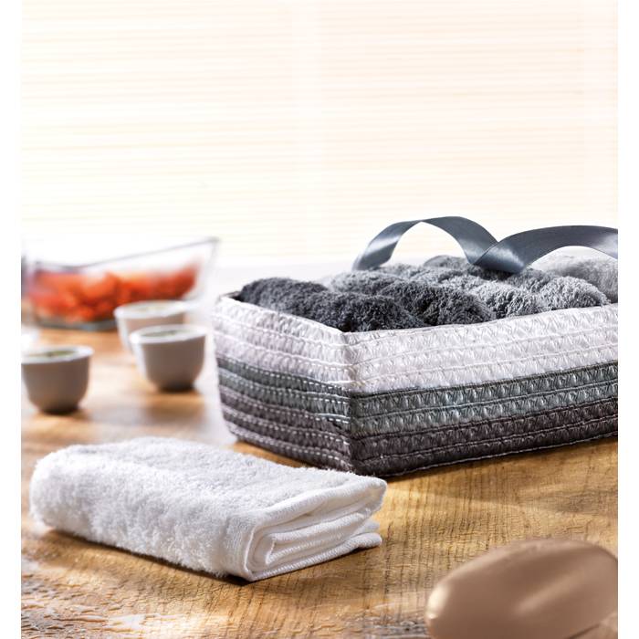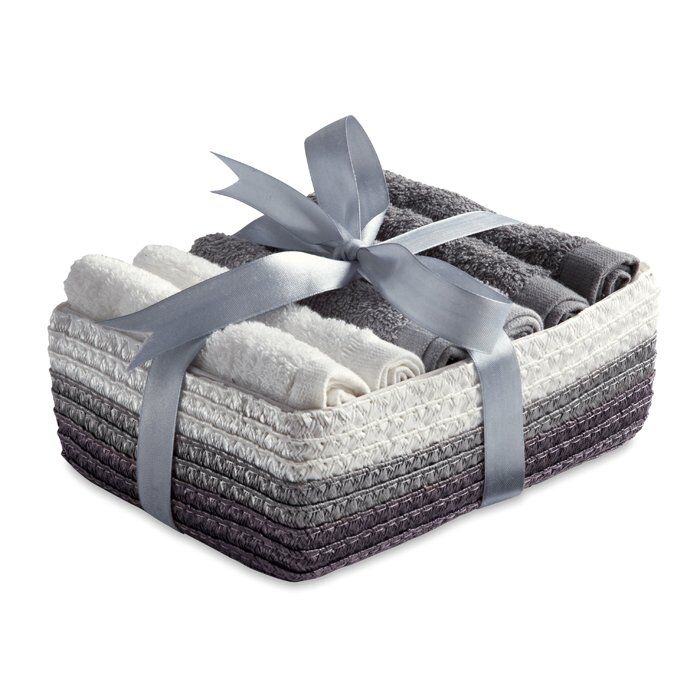 Set of 6 facial or hand towels presented in matching PP basket with ribbon. 100% cotton, 330 gr/m2. Towel size: 30×30 cm.