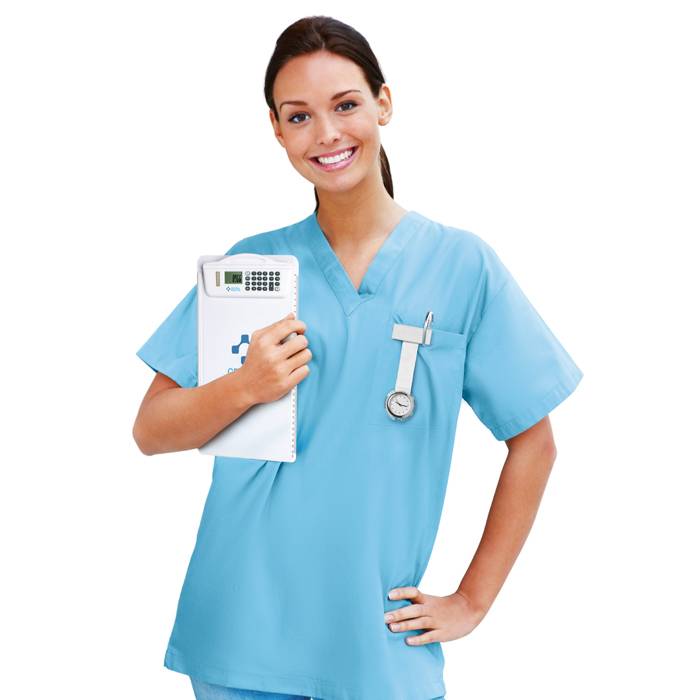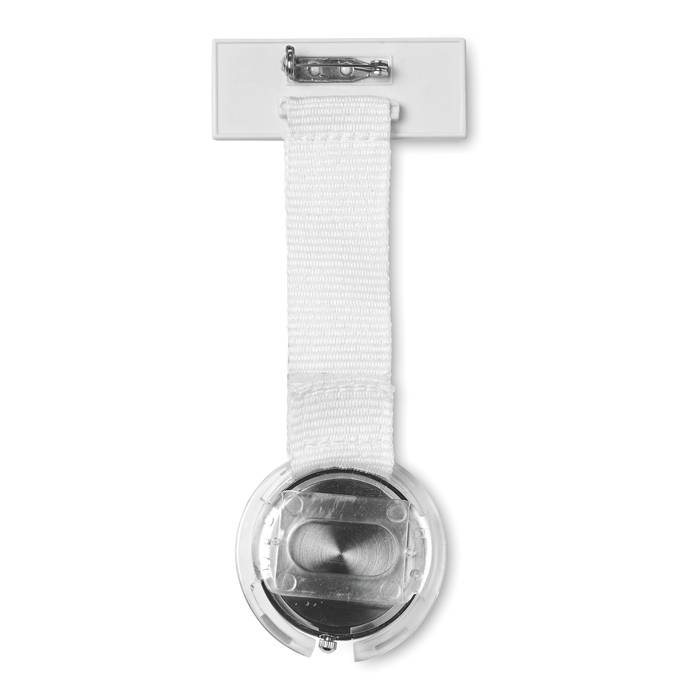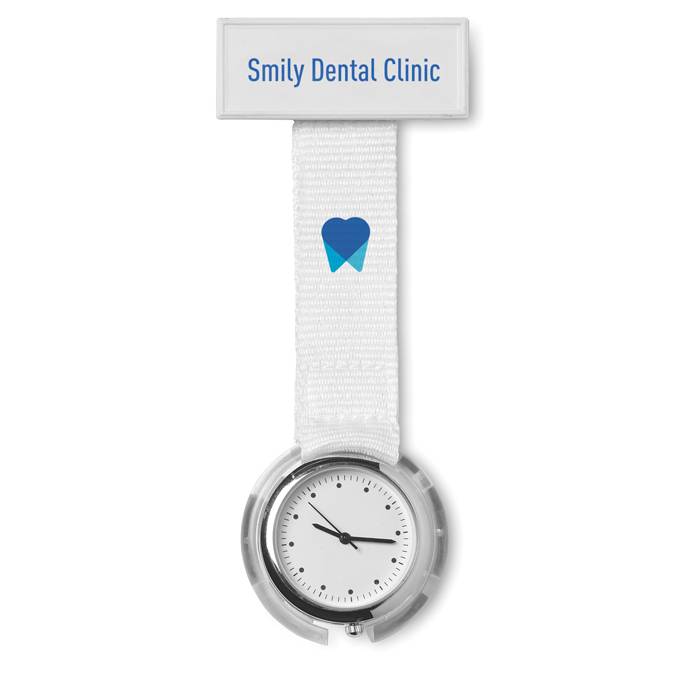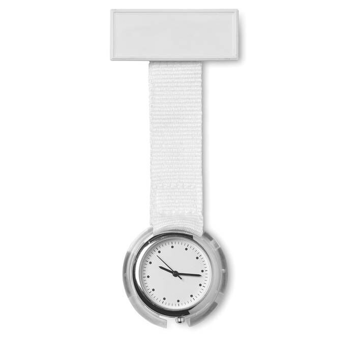 Analogue nurses watch with plastic tag for printing and polyester strap. Water resistant. 1 cell battery included.