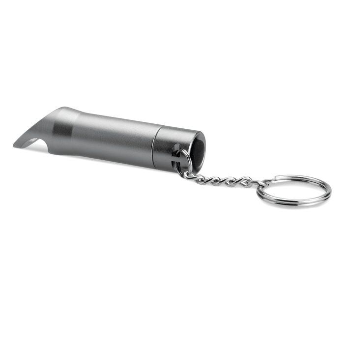 Metal LED torch key ring with bottle opener. 3 cell batteries included.