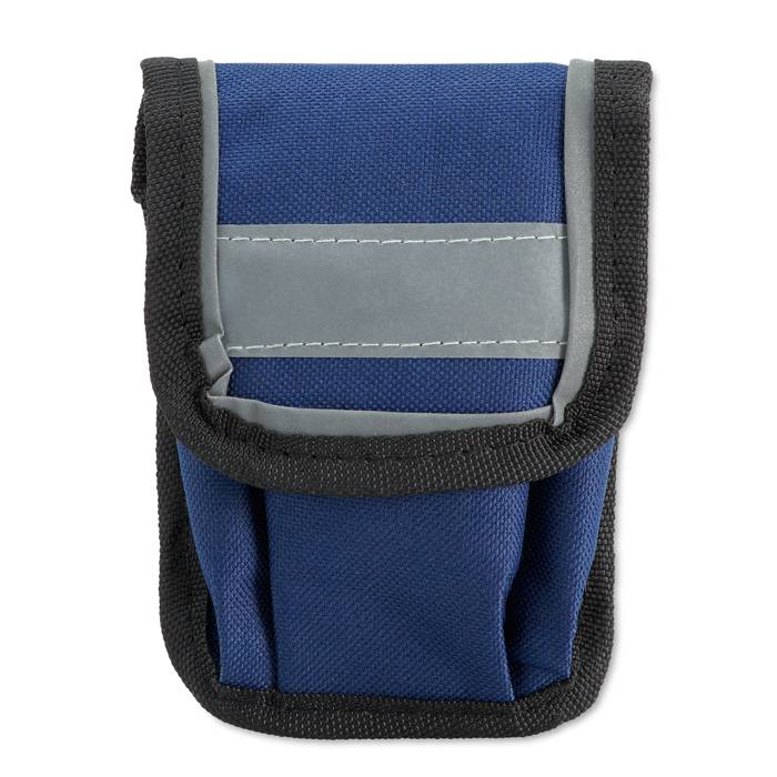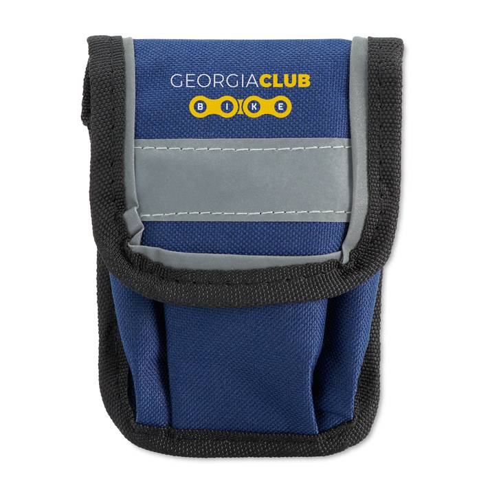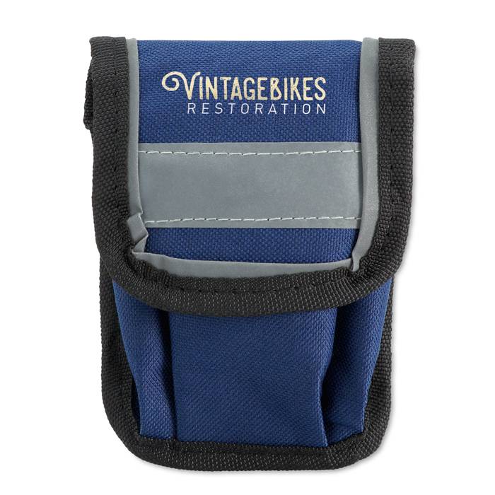 Bike repair kit. 15 piece multitool with 2 tyre levers, grater, glue and stickers including pouch with reflective trim.