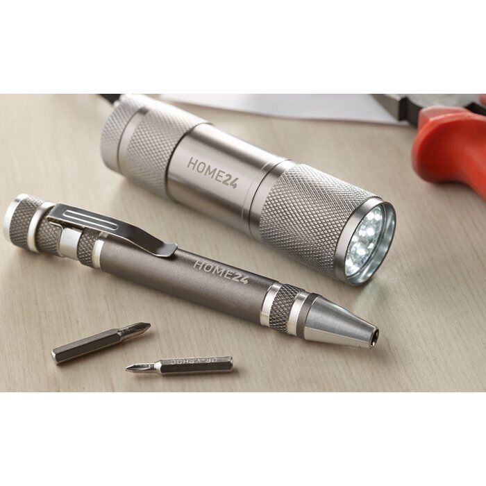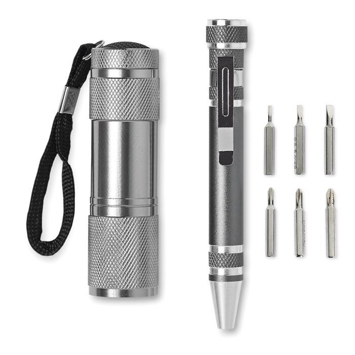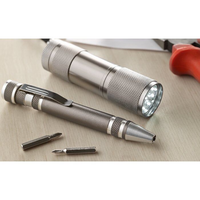 Tool set with 9 LED aluminum torch and aluminum multi-tool in pen shape. Includes 3 slotted and 3 Phillips screwdriver heads. 3 AAA batteries excluded. Presented in a box.
