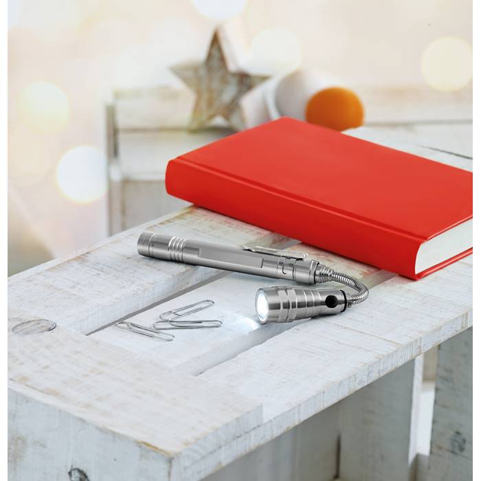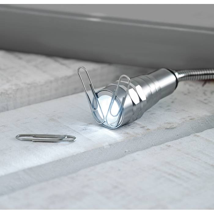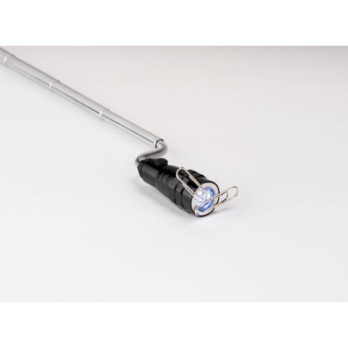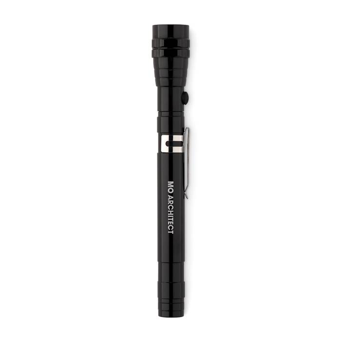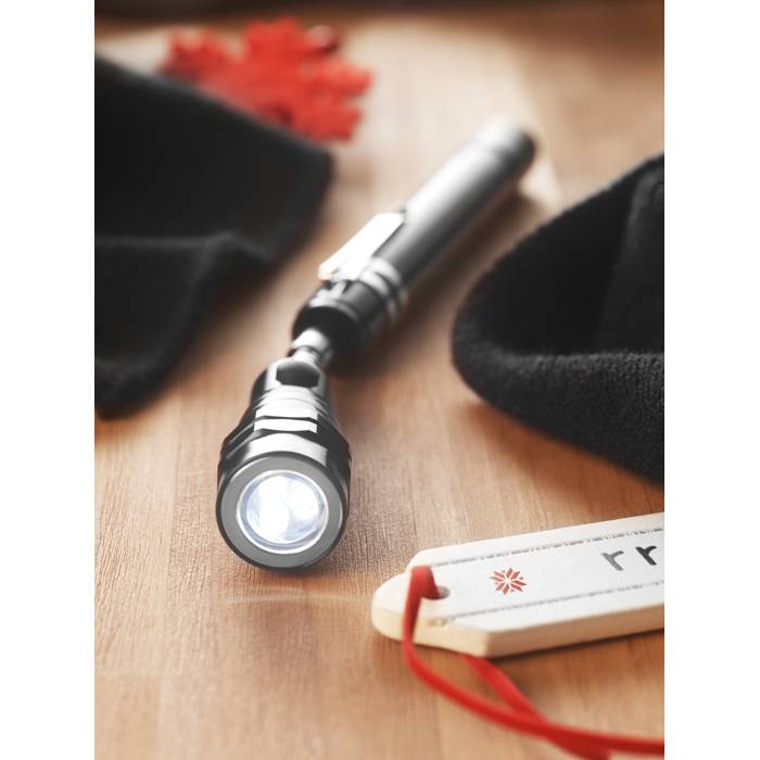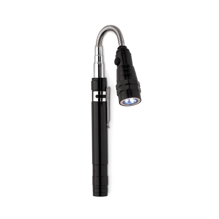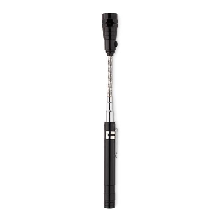 Extendable aluminium torch with 3 LED light and magnet on top and clip on side. 4 Batteries LR44 included. Maximum length 57 cm.