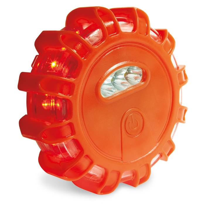 5 LED with various light settings: steady, light only on top, revolving, blinking and flashing, on/off switch, with part rubberized transparent housing, magnet and foldable hooks on the bottom. Excluding 3x AAA batteries.