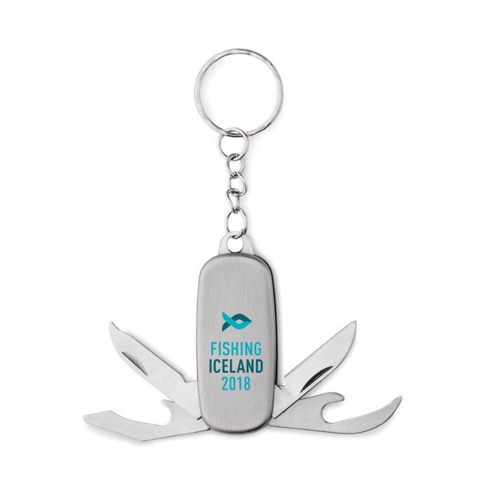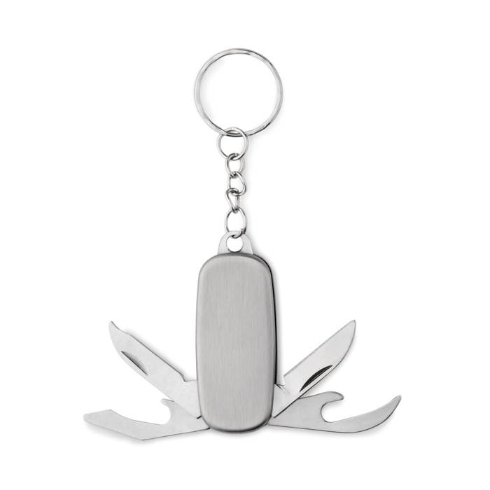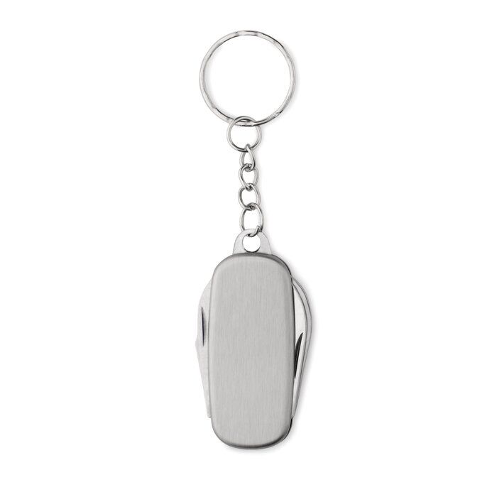 Small multi-function pocket knife and key ring in Stainless steel. 4 functions.