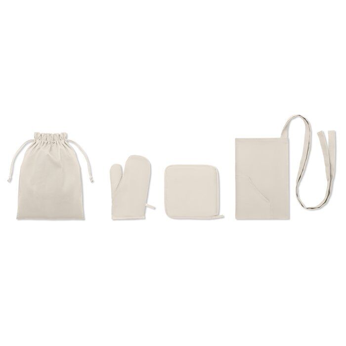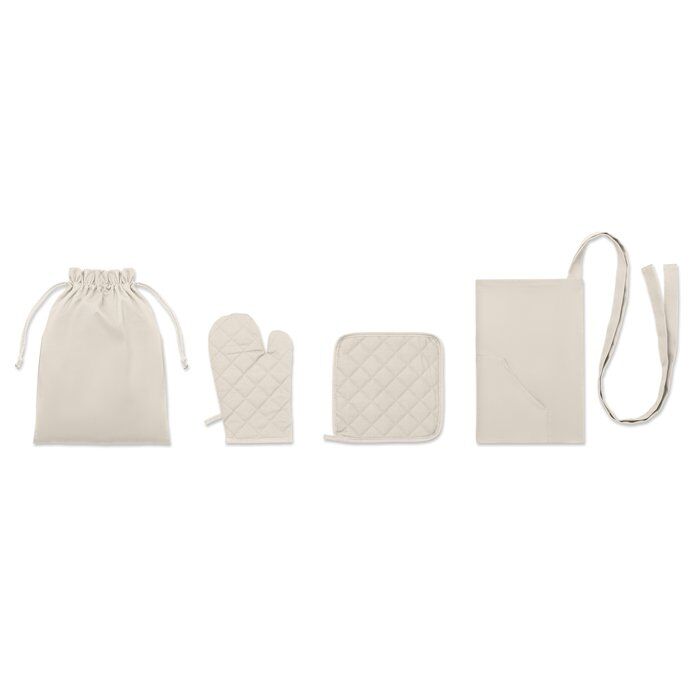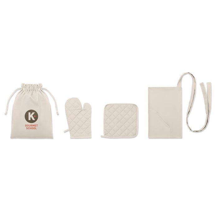 Twill cotton (250 gsm) Apron set with potholder, oven mitt in self material cord bag.