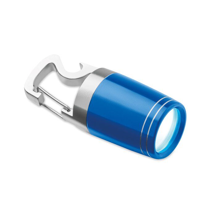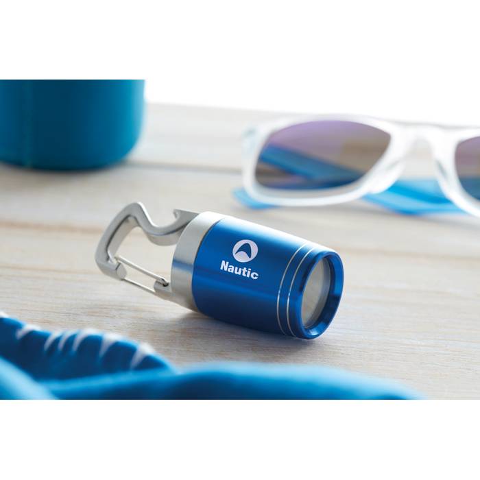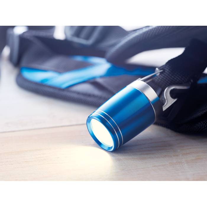 COB Torch in aluminium with bottle opener. Including 2 CR2032 batteries.