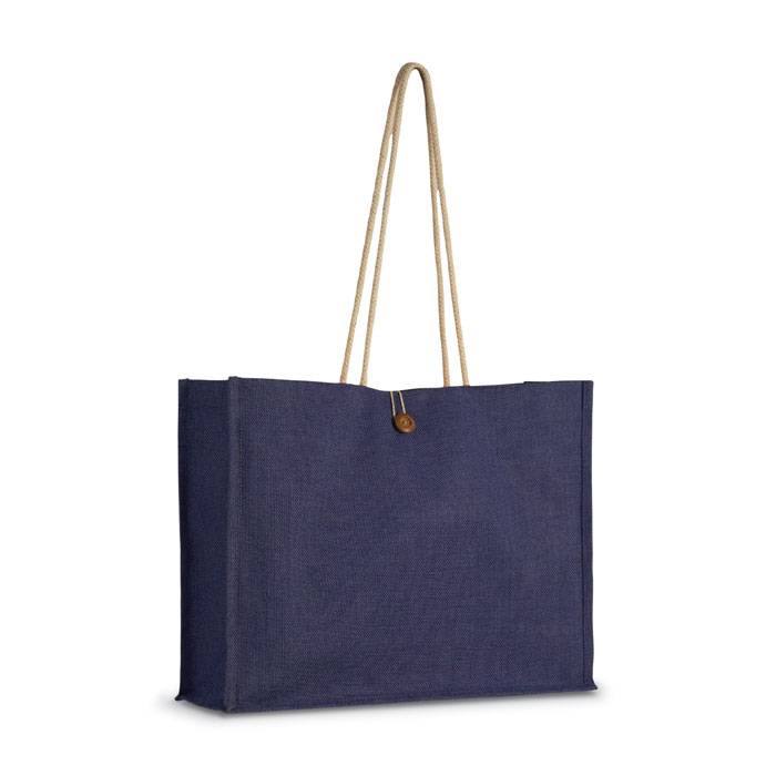 Jute shopper bag with rope handle and wooden closing button.