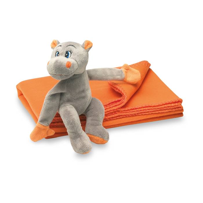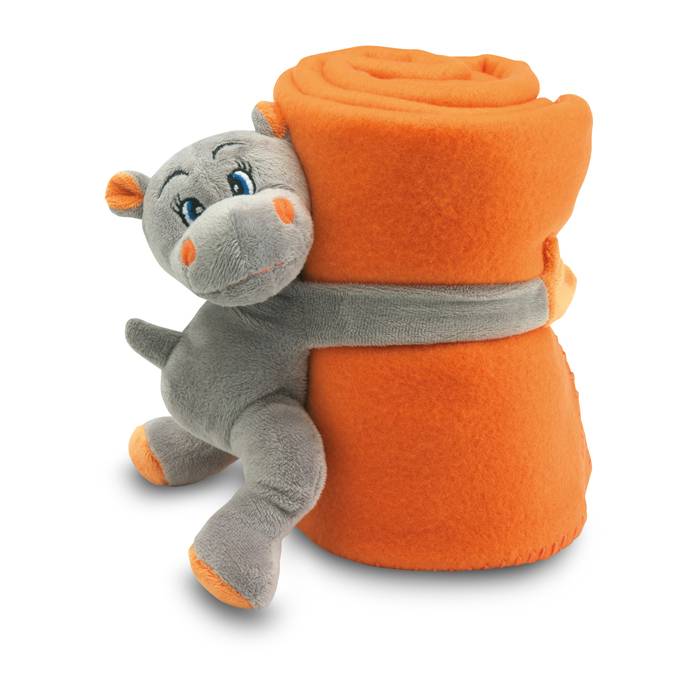 Fleece blanket with lovely plush hippo (180gr/m2). Ideal for children.