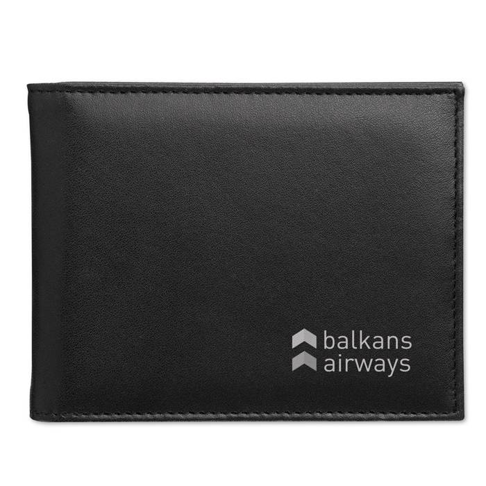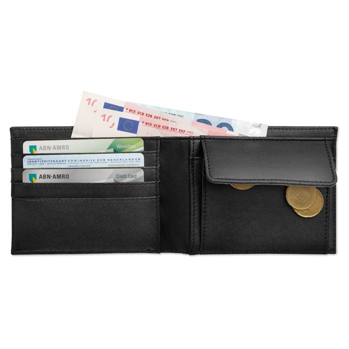 Imitation leather wallet with credit card, notes and coin compartments. Matt finish.