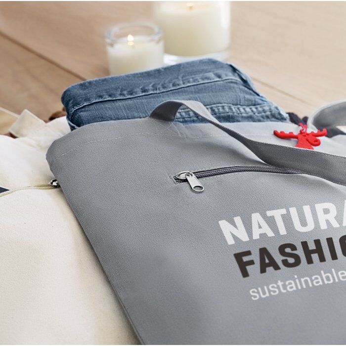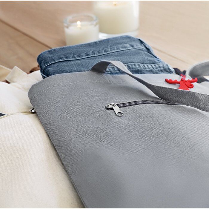 Canvas shopping bag with short handles and front zipped pocket. 280 gr/m².