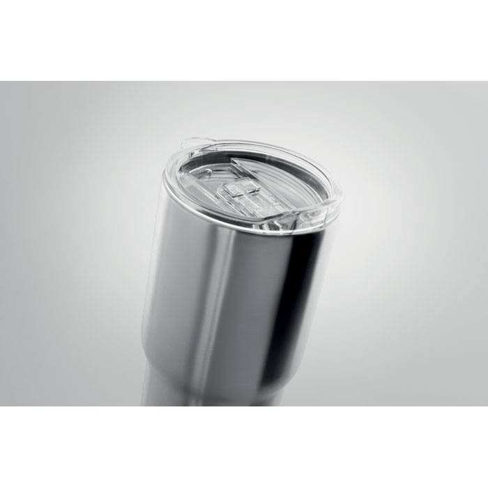 Double wall Stainless steel mug with transparant lid. Capacity: 600 ml.
