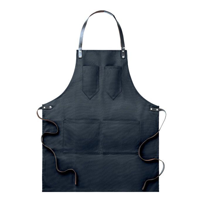 Apron in waxed canvas with leather details, adjustable strap with 2 chest pockets and 1 large low level pocket. 12oz Waxed Canvas.