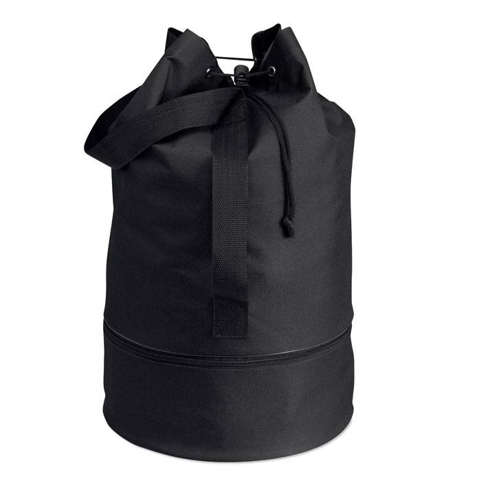 Duffle bag in 600D polyester with zipper compartment at the bottom.