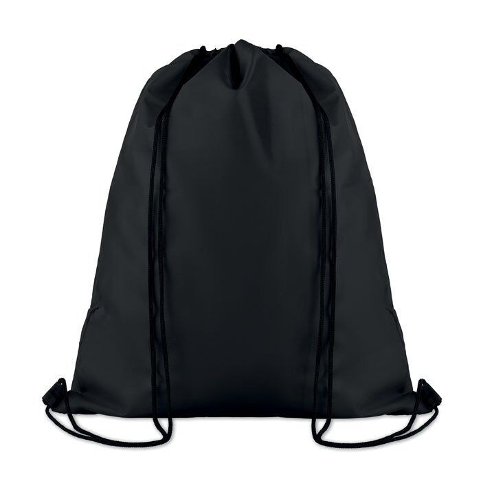 Large drawstring bag in 210D polyester with zippered front pocket.