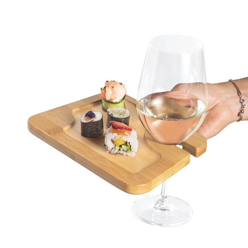 Bamboo plate with cup holder. This plate that is ideal for serving appetizers is supplied in cardboard sleeve. 200 x 147 x 13 mm | Sleeve: 160 x 148 x 14 mm