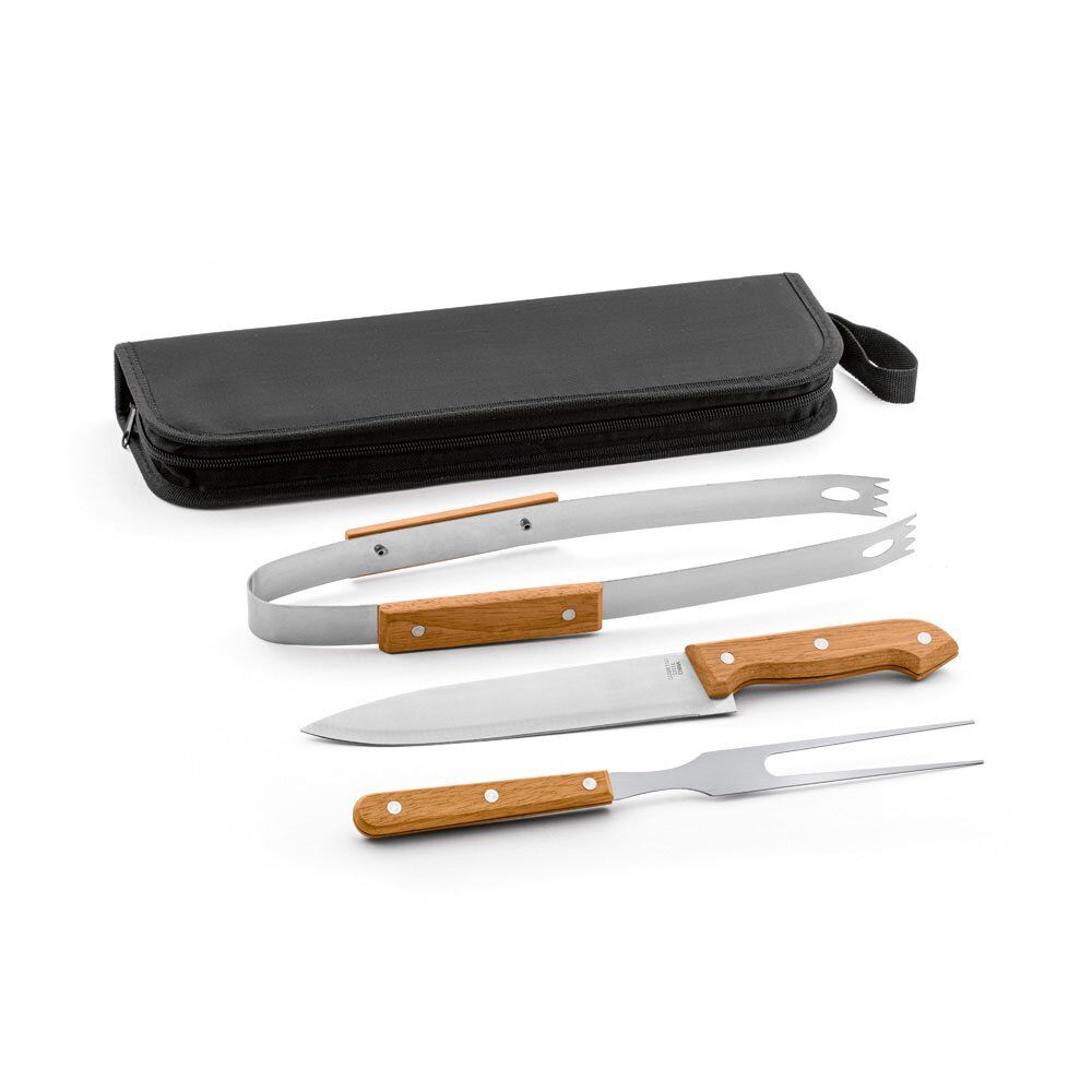 3-piece wood and stainless steel barbecue kit that is supplied in a 210D hard case. Bag: 350 x 230 x 40 mm