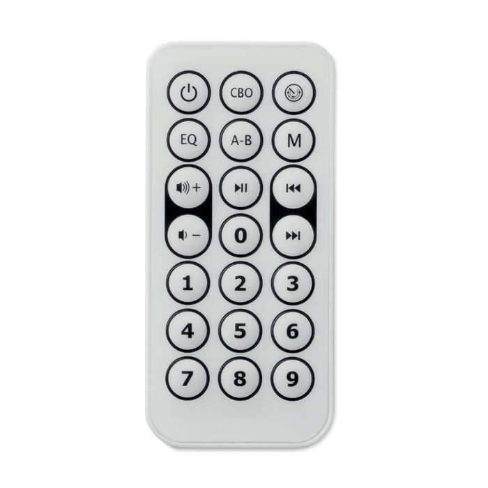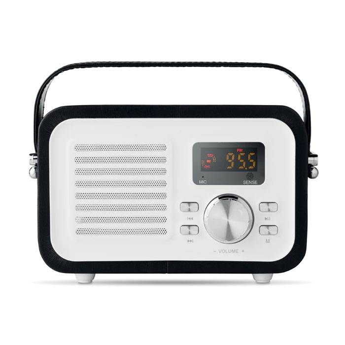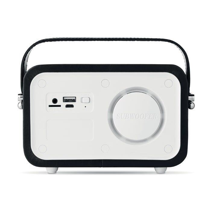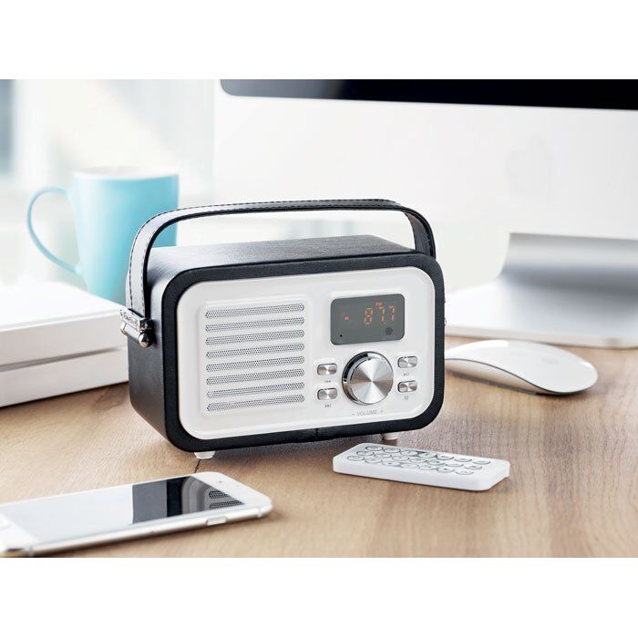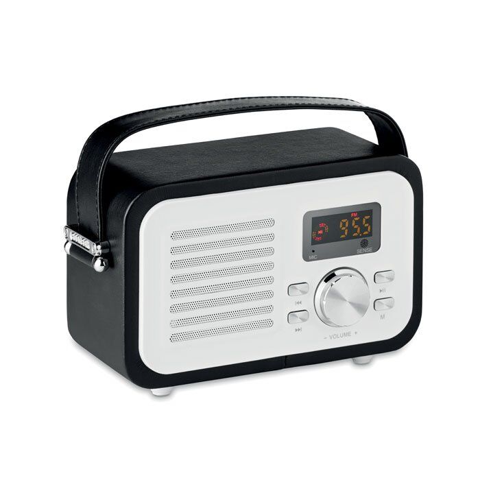 Bluetooth speaker 5W and radio in PU finish. Including Micro SD slot. Auto scan and memory mode. 1200 mAh Rechargeable battery. Remote control included with CR 2025 battery included.