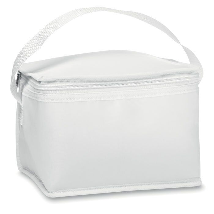 Aluminium foil cooler bag for 6 cans in 210 polyester. With non woven white trimmings. 80gr/m².