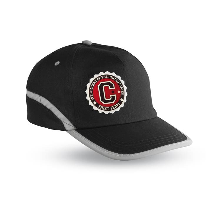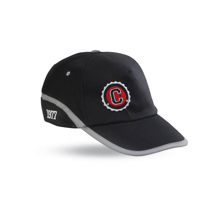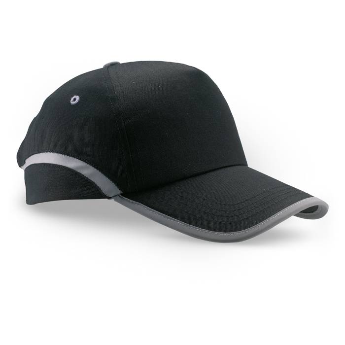 5 panel baseball cap in cotton twill with adjustable hook and loop strap closure. 4 stitched eyelets in grey. Reflective trim around the visor’s edge, the top and the lower part of cap. Size 7 1/4.