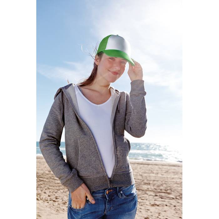 5 panel baseball cap in polyester with adjustable velcrorized strap closure. 2 stitched eyelets in matching colour. Front panel in white, other panels and visor in colour. Size 7 1/4.