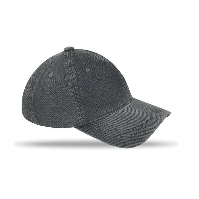 6 panel baseball cap in washed cotton twill with antique silver finish metal clips on adjustable strap closure. 6 stitched eyelets in matching colour. Size 7 1/4.