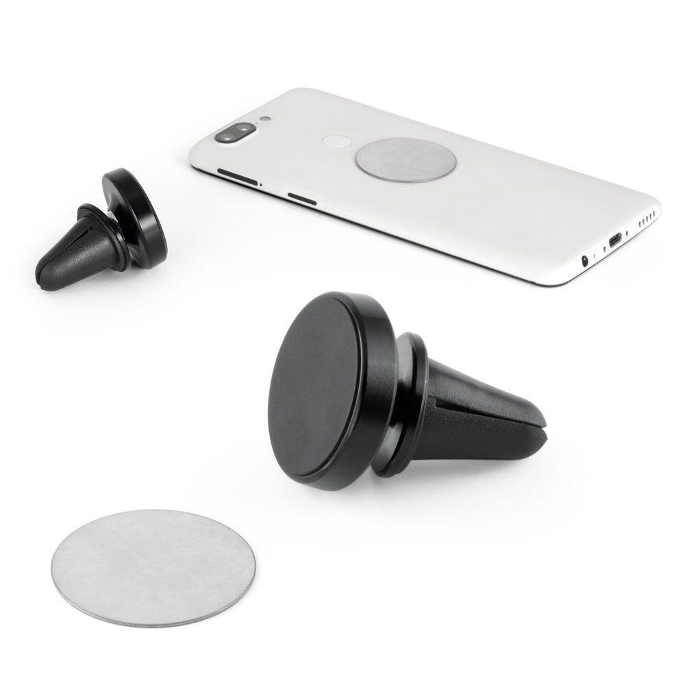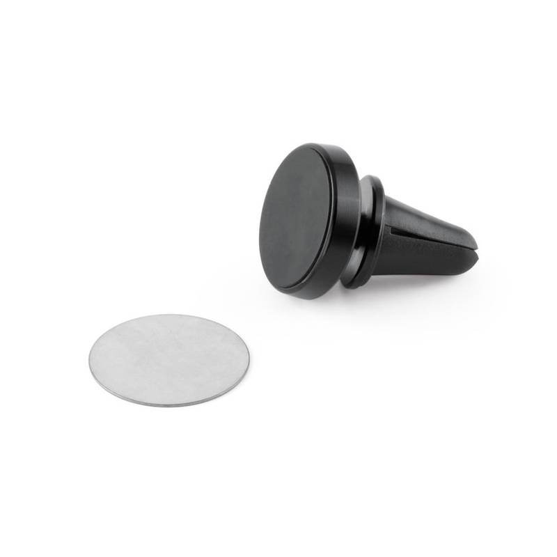 Aluminum car phone holder. This product includes a magnetic metal piece with 360º swivel frame, allowing to adapt the position of the mobile phone. Contains a sticky surface to place on the phone. ø35 x 44 mm