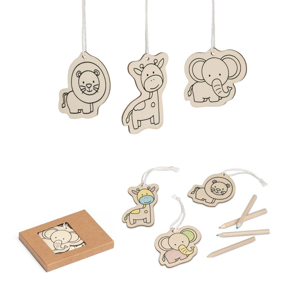 Wooden set for painting. This set contains 3 figures with hanging ribbons and 4 colouring pencils. 122 x 94 x 14 mm