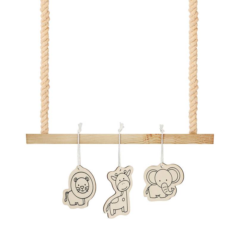 Wooden set for painting. This set contains 3 figures with hanging ribbons and 4 colouring pencils. 122 x 94 x 14 mm