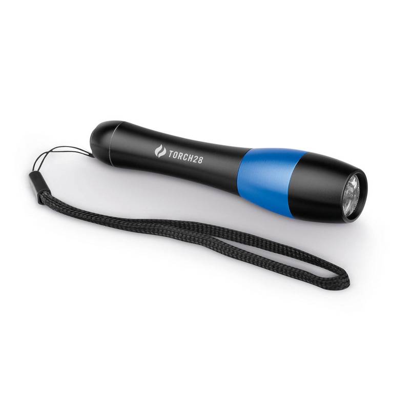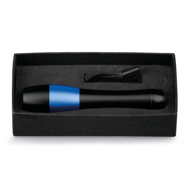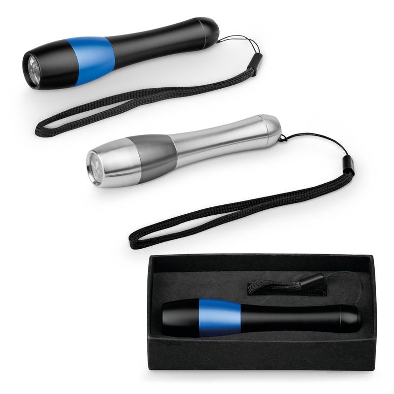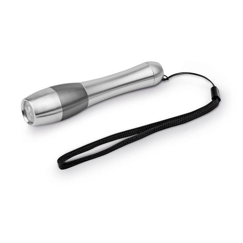 Metal LED flashlight with 3 LEDs and wrist strap supplied in a paper gift box. Requires 1 AAA battery (not included). Box: 122 x 28 x 65 mm