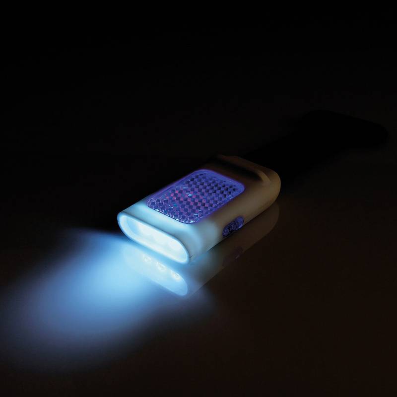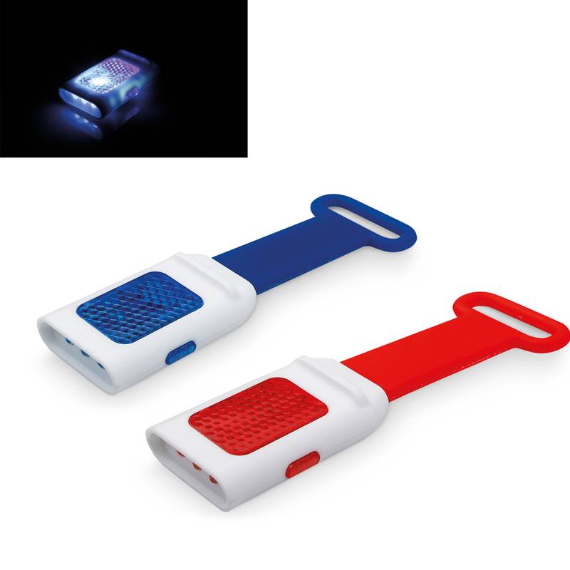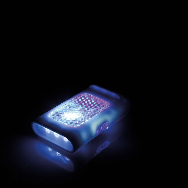 4-LED flashlight with reflector and flash function. This flashlight has 3 modes and includes batteries. Torch 53 x 13 x 30 mm | Silicone band: 70 x 4 x 35 mm