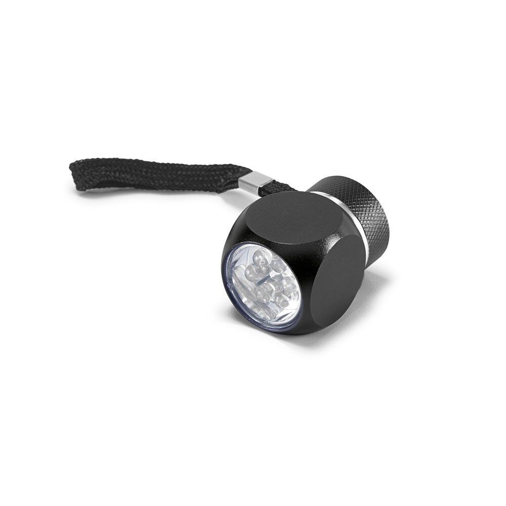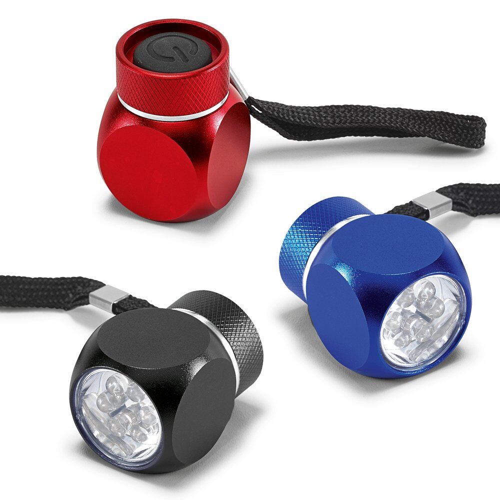 Aluminum flashlight with 6 LEDs. Includes 2 CR2032 batteries. 28 x 40 x 28 mm
