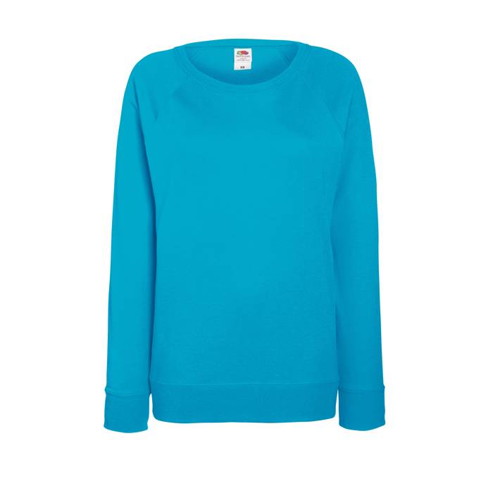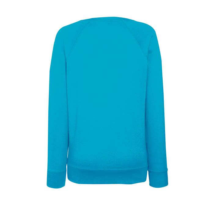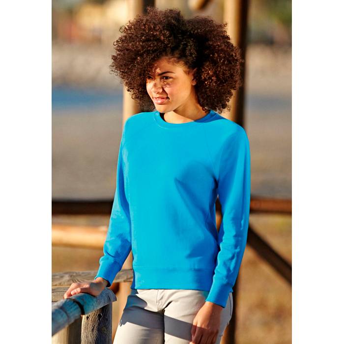 Lady fit raglan sweatshirt made from 240 g/m2. 80% cotton (Belcoro® yarn), 20% polyester. Lightweight unbrushed fleece. Raglan sleeves. Neck, waist and cuff in cotton/Lycra® rib. Shaped side seams for a feminine fit. Produced using Belcoro® yarn for a softer feel and cleaner printing process.