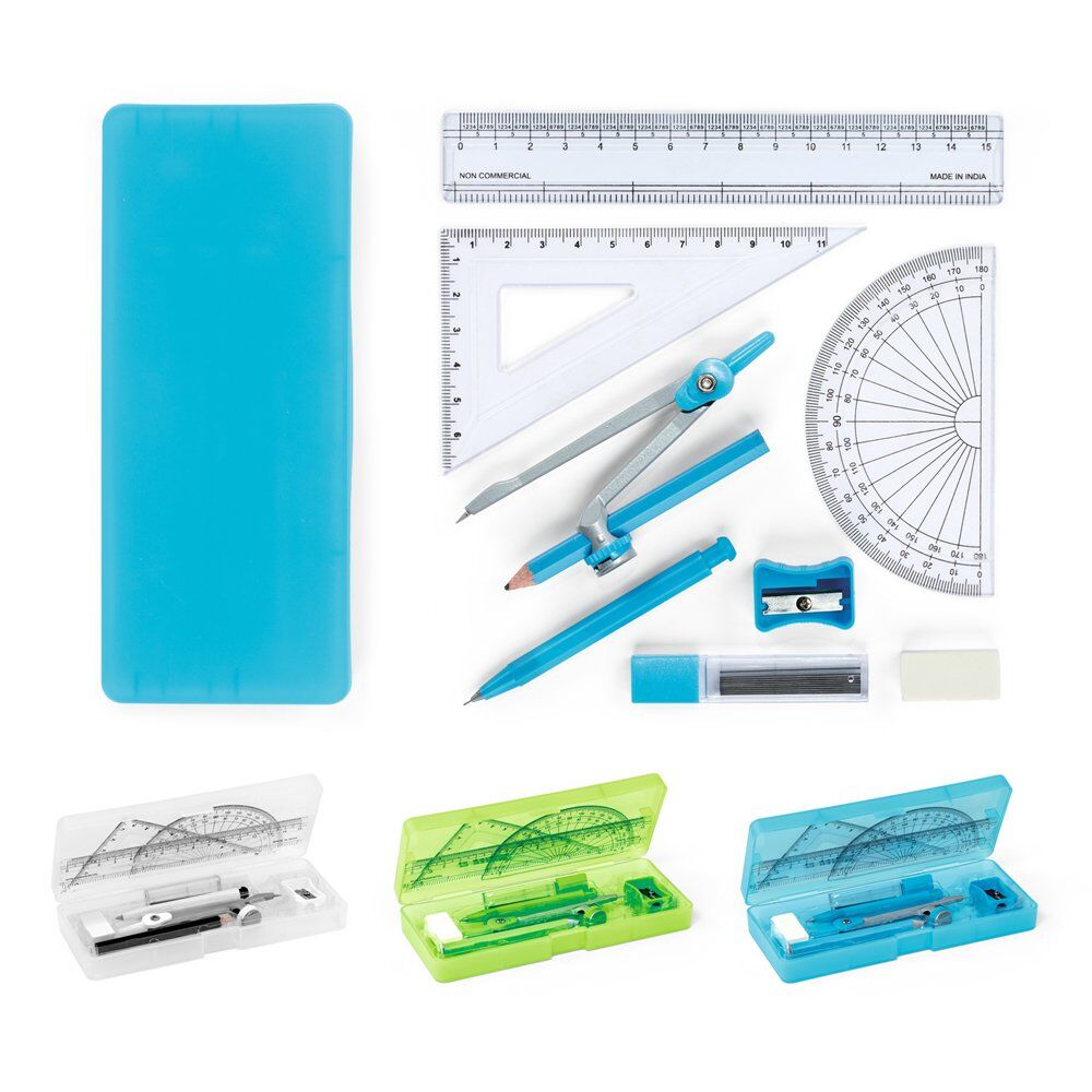 Geometry school set in PP box. This set contains 9 pieces: 1 compass, 1 eraser, 1 sharpener, 1 pencil, 1 mechanical pencil, 10 leads (0.5 mm), 1 ruler, 1 square and 1 protractor.