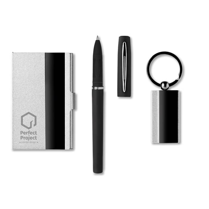 Business gift set including pen, zinc alloy key ring, and matching card holder. Presented in a box.