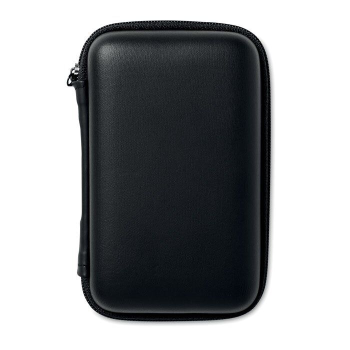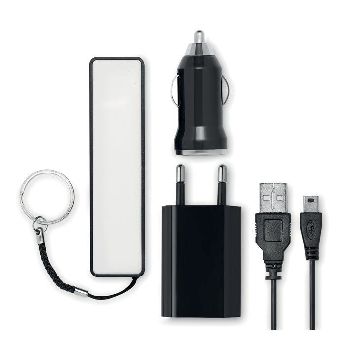 Travel set presented in EVA pouch. Includes Powerbank 2000 mAh, USB car charger, micro usb cable and USB adaptor with EU plug. Power bank output current DC5V/1A.