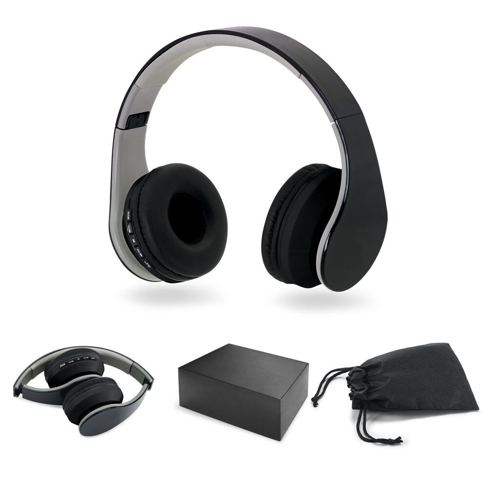 Foldable ABS headphones with bluetooth transmission, TF card reader and autonomy up to 4h. Allows you to answer calls, control volume, connect to your mobile device playlist and FM radio. They include a USB/micro USB cable for charging and are supplied in a gift box (non-woven pouch included). Folded: 120 x 180 x 80 mm | Pouch: 200 x 250 mm | Box: 127 x 171 x 90 mm
